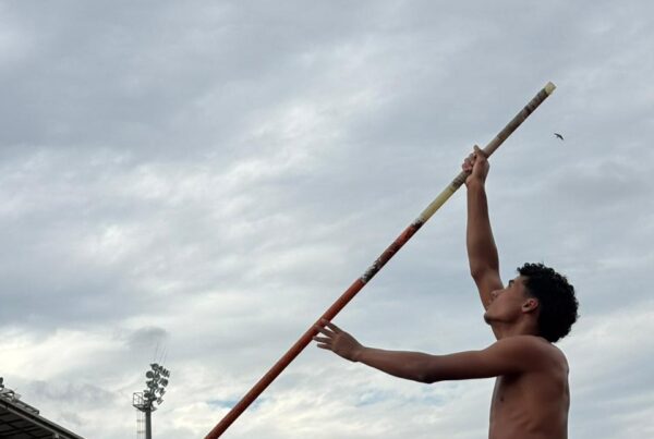 Registro de sete dos vinte atletas do Projeto Corridas, Saltos, Lançamentos e Superação, devidamente uniformizados, junto ao técnico Lucas Apolinário…