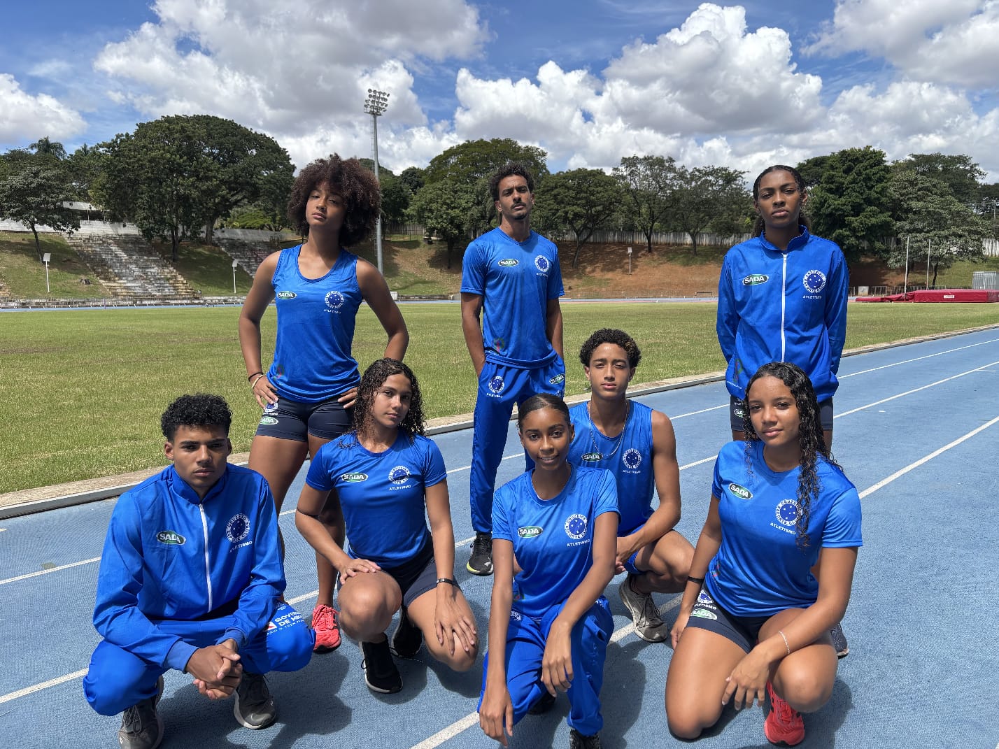 Registro de sete dos vinte atletas do Projeto Corridas, Saltos, Lançamentos e Superação, devidamente uniformizados, junto ao técnico Lucas Apolinário em mais uma sessão de treino, reforçando o compromisso com a preparação e o desenvolvimento esportivo.