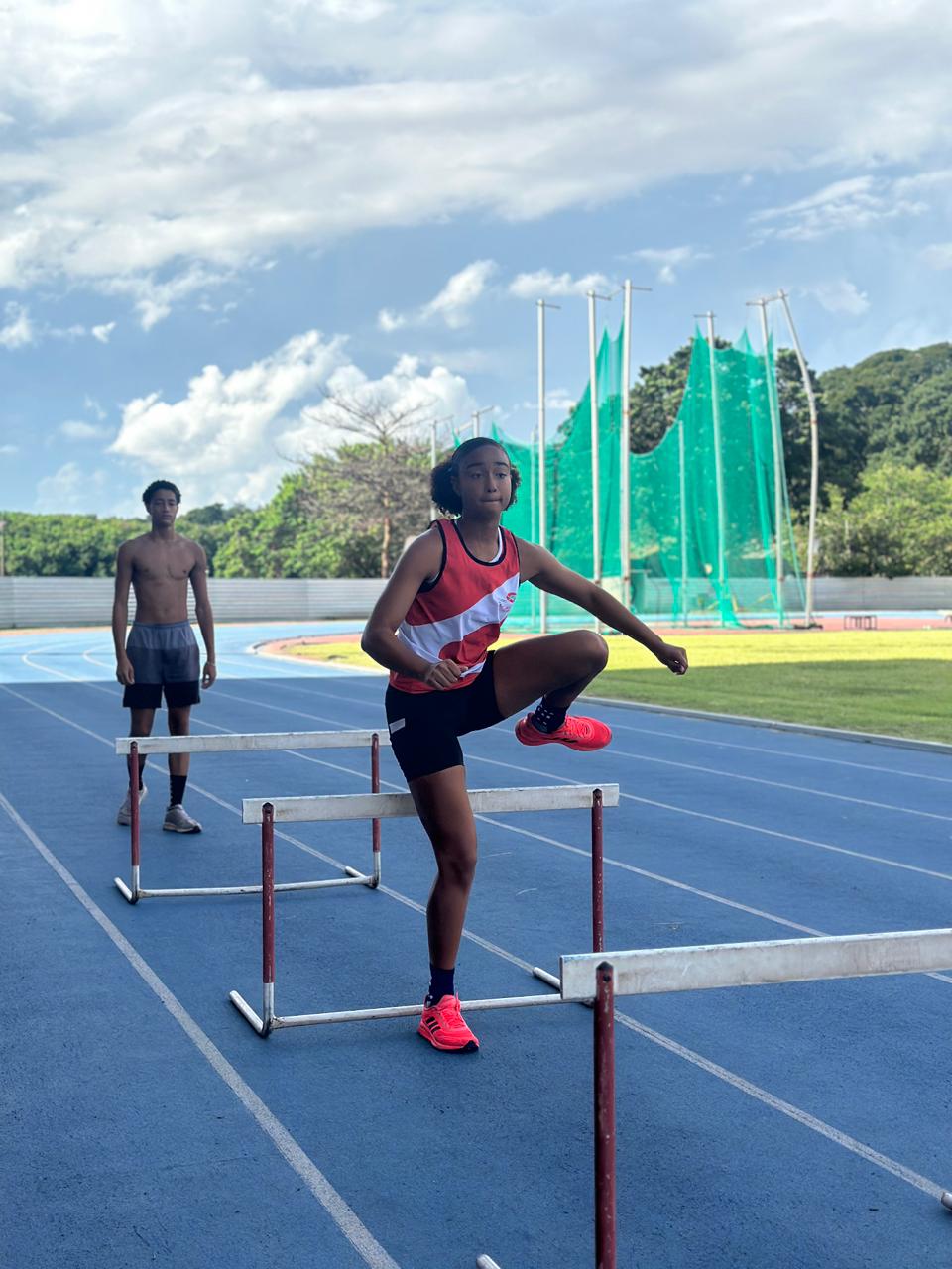 Atleta Elis Regina do Projeto Corridas, Saltos, Lançamentos e Superação em treinamento técnico de corrida com barreiras, com foco no desenvolvimento da coordenação motora, ritmo de passada e eficiência na transposição dos obstáculos.