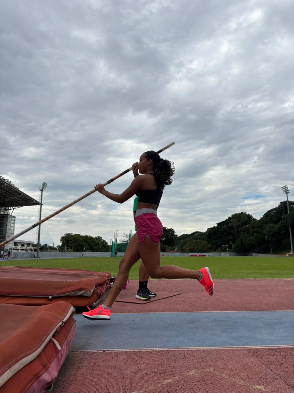 Atleta Silvia Vitória Goveia do Projeto Corridas, Saltos, Lançamentos e Superação durante sessão de treinamento de salto com vara, desenvolvendo técnica de aproximação, impulsão e controle corporal, fundamentais para a evolução na modalidade.